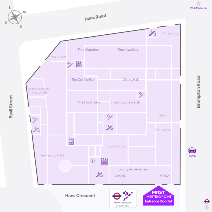 Meet the FIRST and Harrods team at Entrance Door 5A, marked on the map. The entrance opens from Hans Crescent, a pedestrianised zone, next to the Harrods/Brompton Road exit to Knightsbridge tube station.