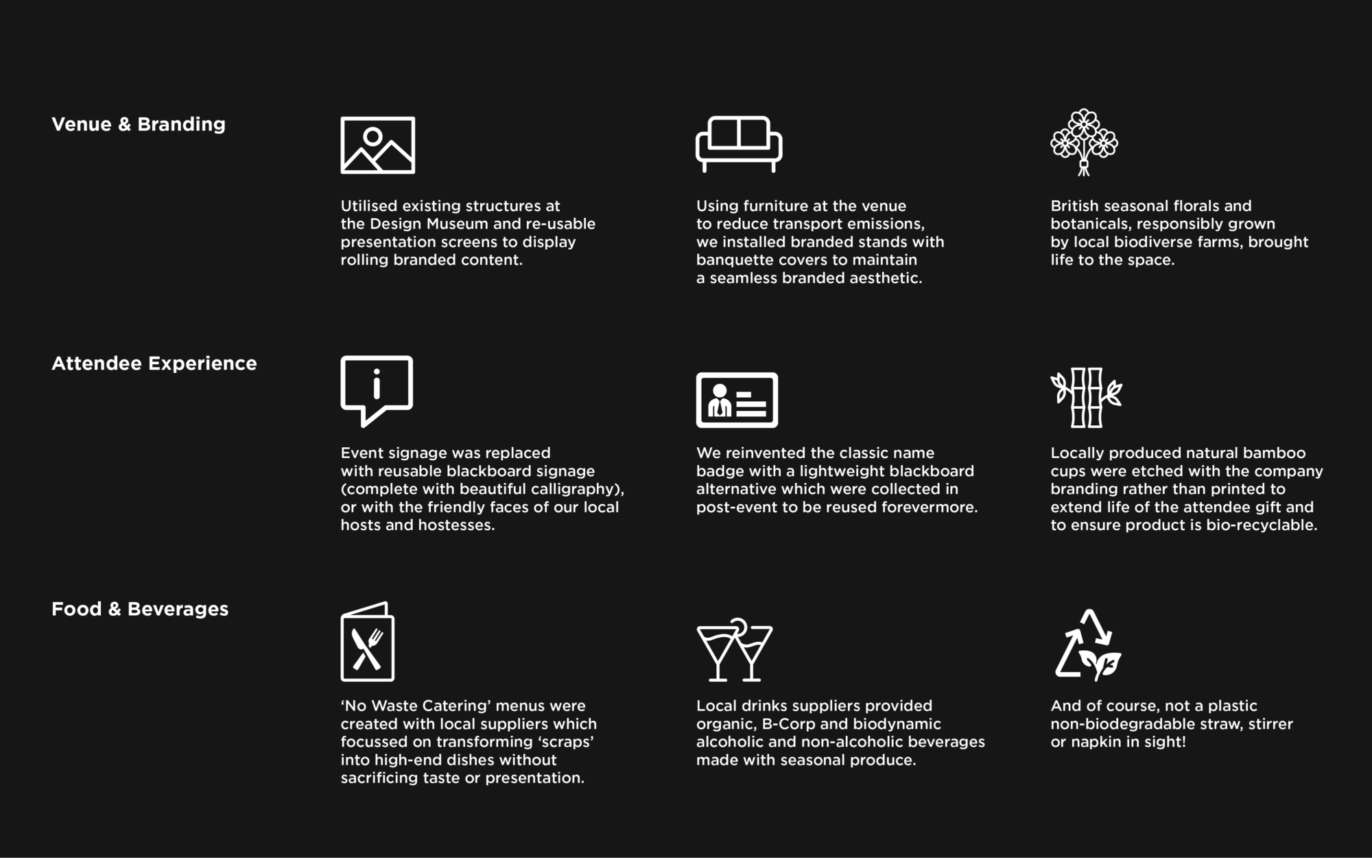 Hosted at the Design Museum in London, UK (recently awarded the highest BREEAM rating), FIRST looked to elevate this highly anticipated event with fully eco-friendly solutions at every step, whilst delivering a fun, interactive networking experience, expert content presentations, all with a celebratory ‘after-party’ feel to mark the end of the Air Show.